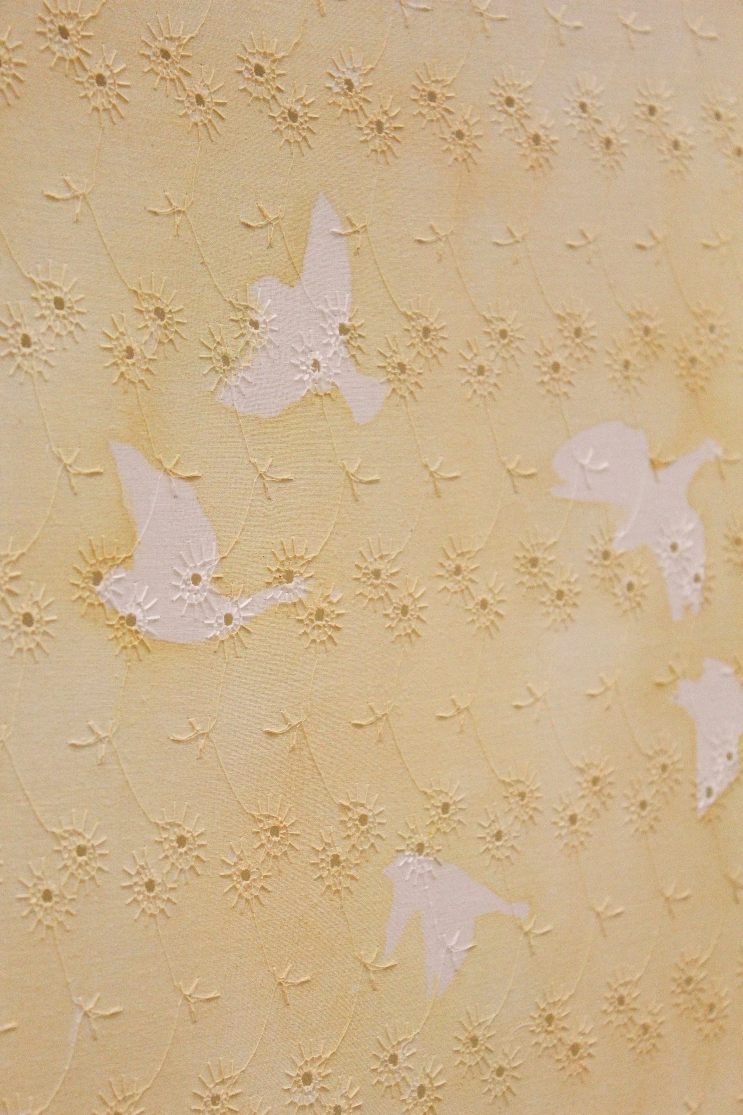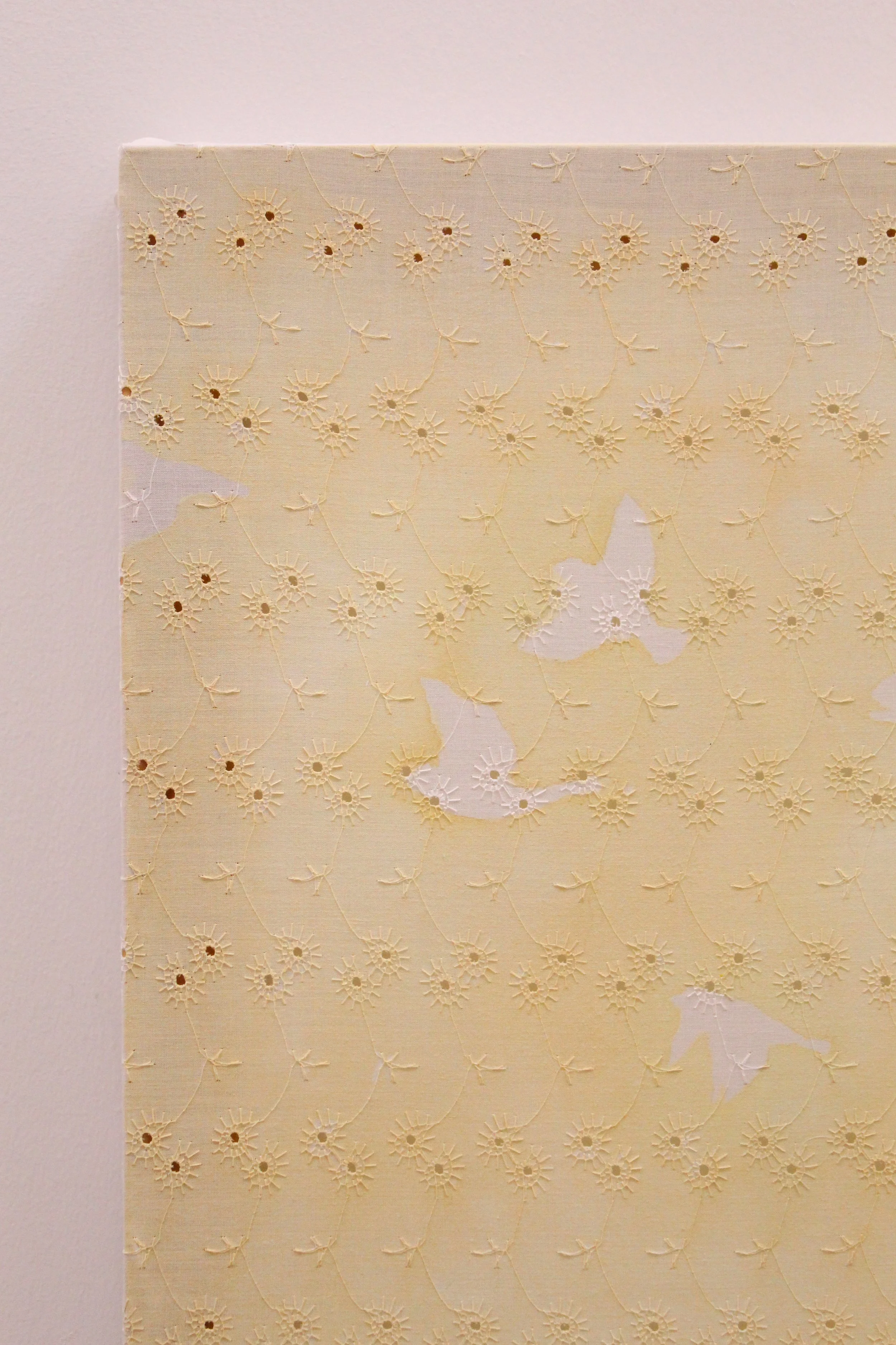 Description: Pale yellow acrylic stain subtly blends to a soft green at the bottom. The stain frames the silhouettes of birds taking flight, left the original color of the white eyelet cotton fabric. Stretched on salvaged wood canvas frame. Read more about my work here.